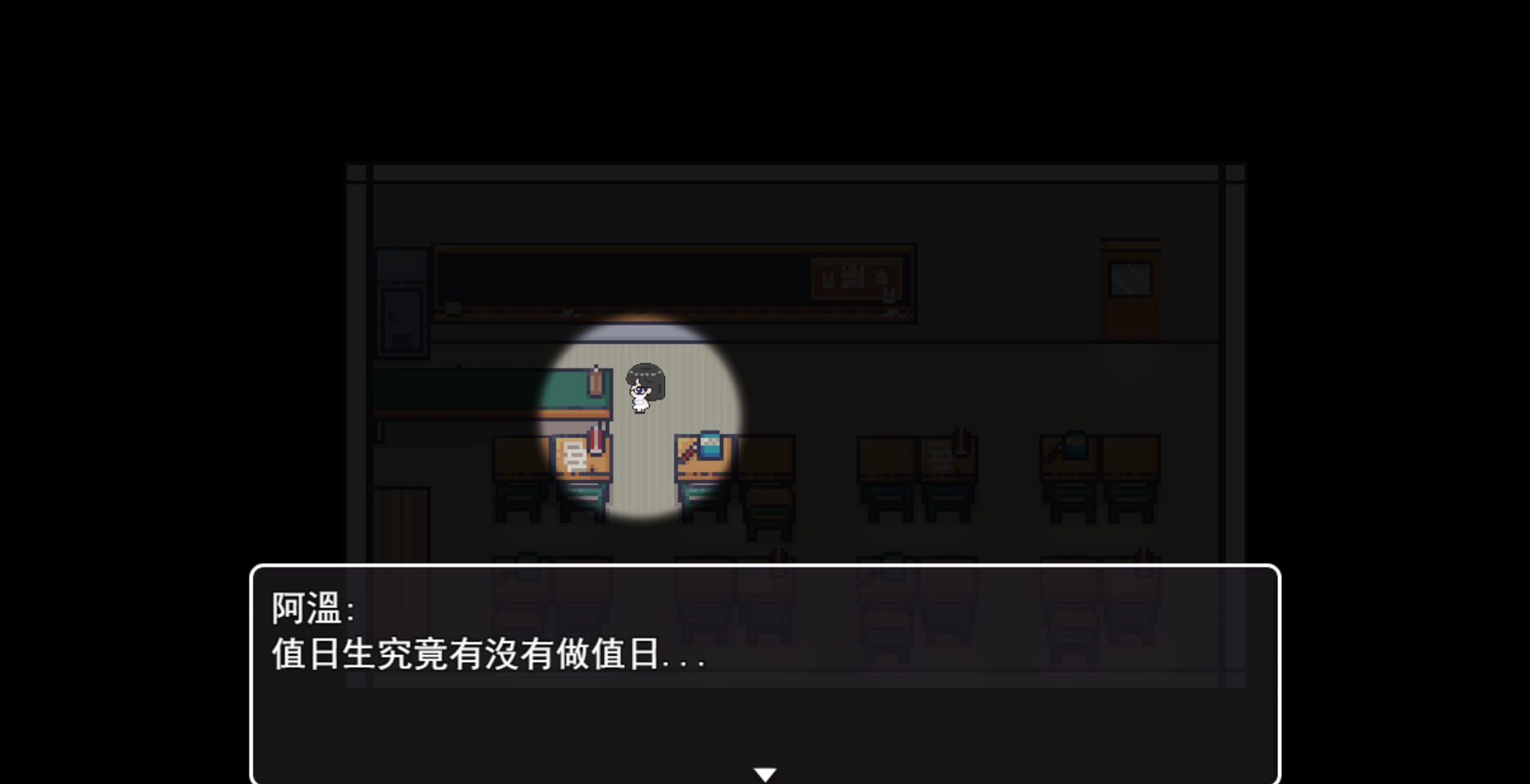 這是個在學校裡解謎的校園RPG遊戲。你扮演中學的學生阿溫,醒來發現校園變樣了,整個校園被封鎖異變,到處是鬼怪。你必須在學校三樓教室中翻箱倒櫃尋找線索,解開各種與校史相關的小謎題(比如解開數學算式、探索密碼、完成拼圖等等)來拿到鑰匙,才能打開新區域。你需要利用紙條上的生存法則,躲避巡邏的骷髏守衛。你打不過它們,只能靠紙條上的提示跟怪物玩躲貓貓,一路慫到底,直到找出背後的秘密。